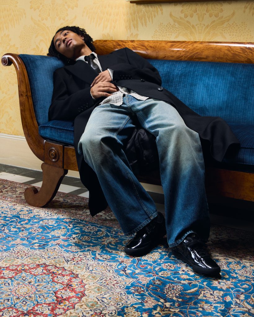 A retro, low profile shape is dressed in glossy patent leather, contrasted by tooth-like lugs underfoot.