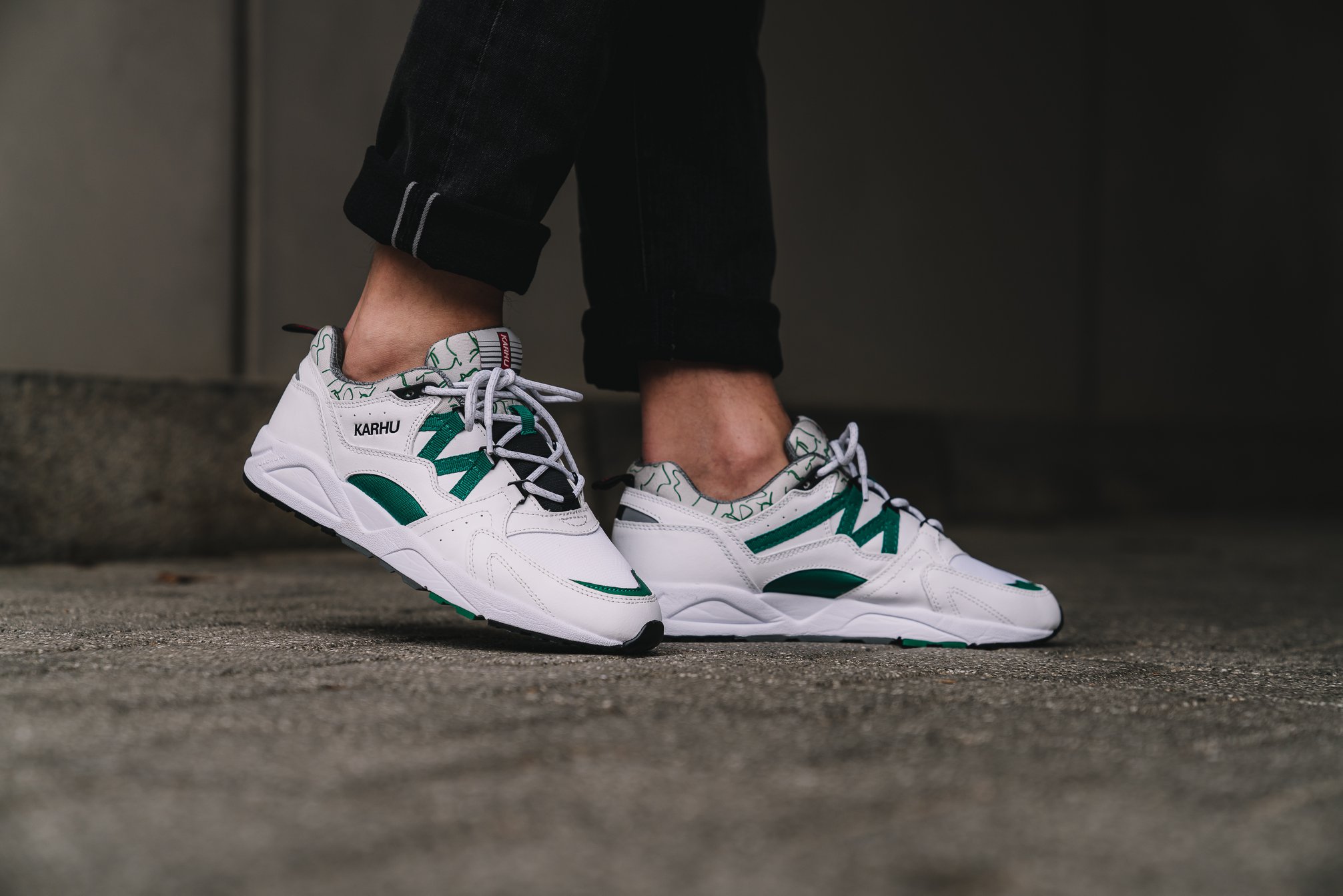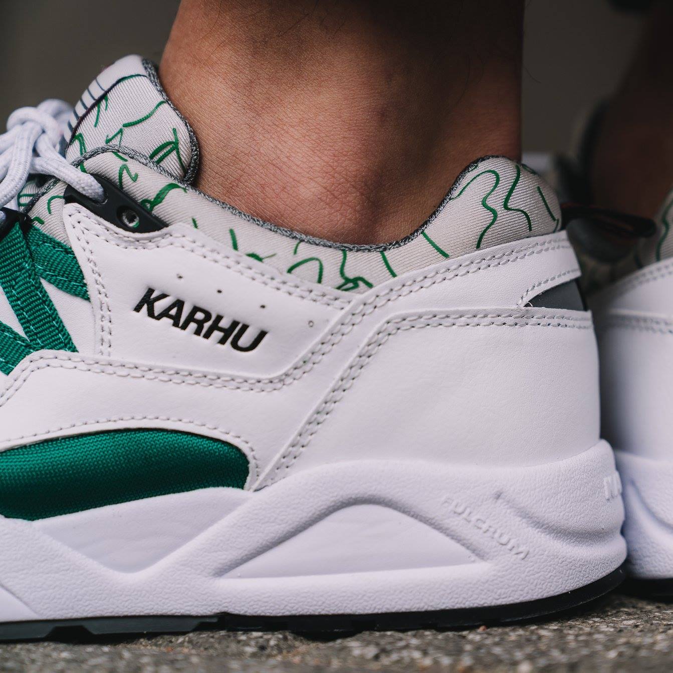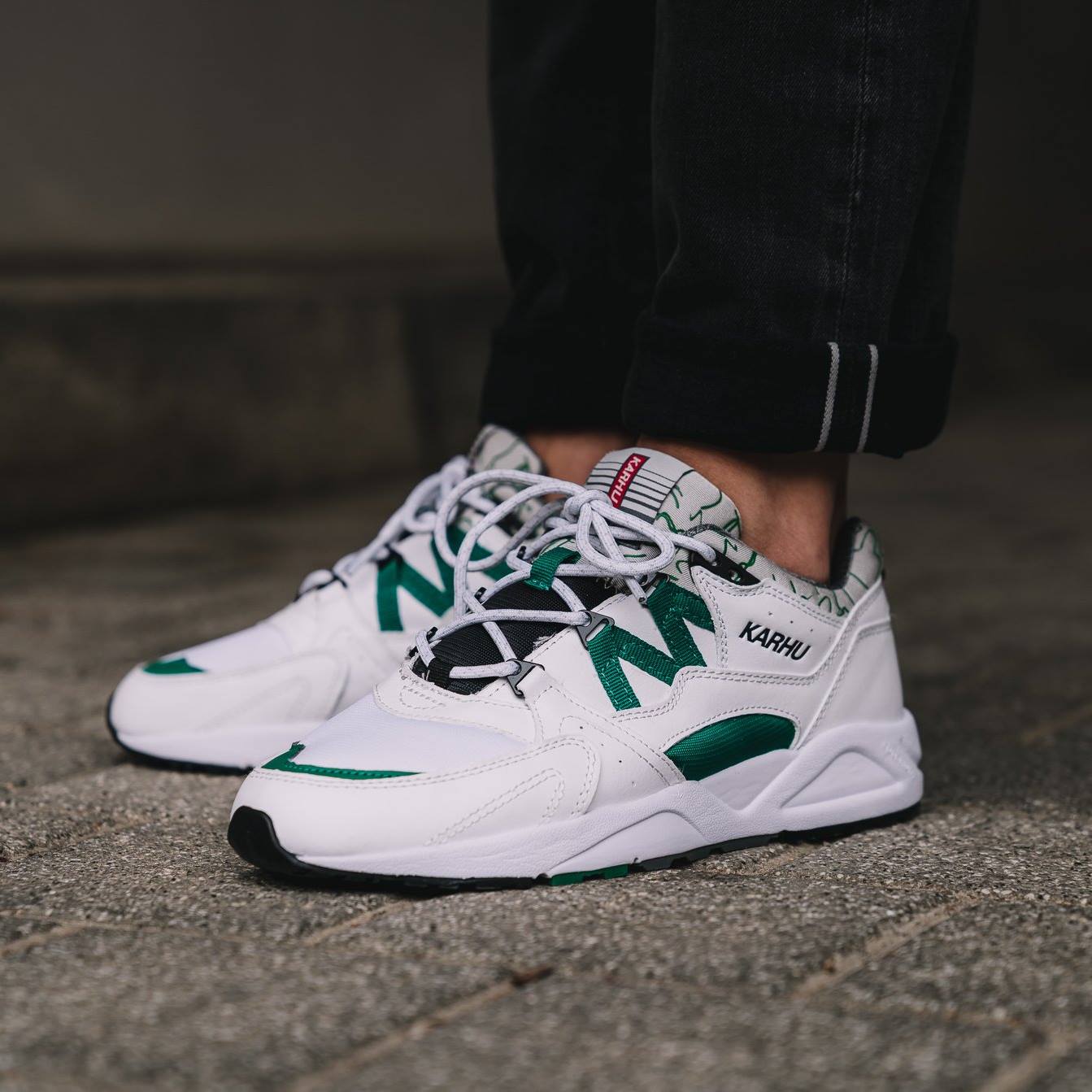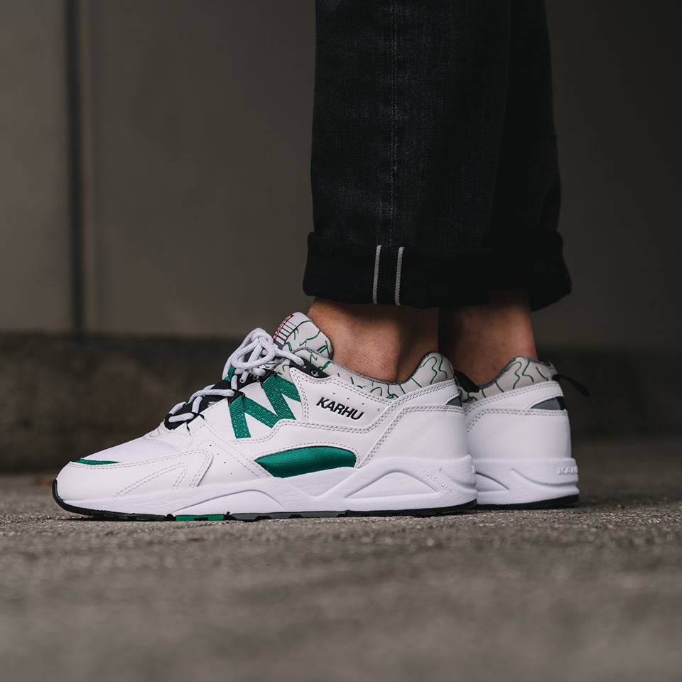 The latest release from the Finnish footwear giant Karhu sees the Fusion 2.0 re-release in the original colourway, white and ultramarine green. Notable features that mirror the ’96 design include the printed lycra fabric at the tongue and around the ankle collar, shortened webbing tape at the side walls and red Karhu branding at the heel tab.